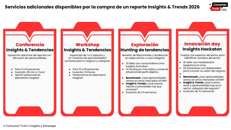 Descubre qué está cambiando en la forma como experimentamos el consumo y disfrutamos diferentes categorías de productos/servicios. Te invitamos a ver qué tendencias globales pueden ser más relevantes en el mercado peruano.